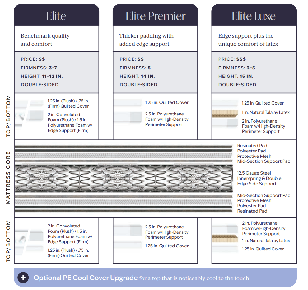 The Elite Series represents our benchmark offering for two-sided mattresses, combining exceptional durability with versatile comfort options. For those seeking mattresses built to last through years of use, Elite mattresses feature a superior offset coil innerspring system (12.5 gauge steel) that provides more flexibility and support than traditional Bonnell coils, double-sided construction that allows regular rotation and flipping to extend mattress life, and double-edge coil side supports (12-14 depending on size) that deliver superior edge strength and sleeping surface. Every Elite mattress is hand-assembled in Sugarcreek, Ohio, where skilled Amish artisans build each one with meticulous attention to detail, using high-density 1.8+ weight foam padding that outlasts industry-standard materials by years. Available in three configurations—Elite (10.5-13″), Elite Premier with enhanced edge support and pillowtop options (13″), and Elite Luxe featuring breathable natural Talalay latex (14″)—these reversible mattresses deliver reliable comfort in multiple firmness levels from plush to firm. We stand behind this quality with an industry-leading 20-year limited warranty (10 years full coverage, 10 years prorated) because when you can flip your mattress for even wear, it should truly last decades. Optional PE Cool Cover upgrade available for enhanced temperature regulation. Built to be flipped, rotated, and cherished for years to come!